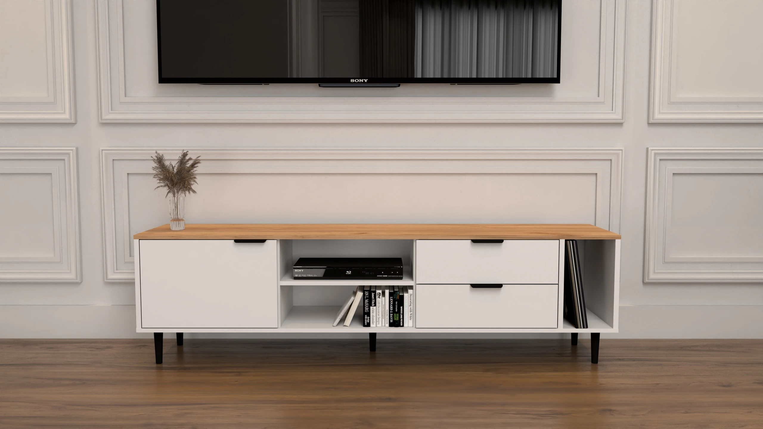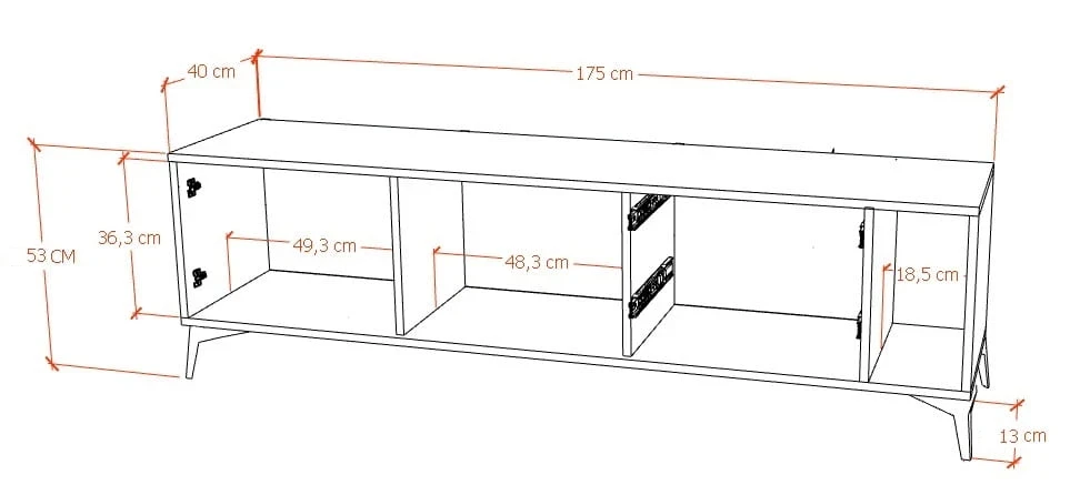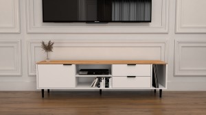 Mebel wyposażony jest w dwie pojemne szuflady, które doskonale sprawdzą się do przechowywania drobnych akcesoriów. Zamknięta wnęka za drzwiczkami umożliwia ukrycie rzeczy, które chcesz mieć pod ręką, ale poza widokiem. Dodatkowo szafka posiada otwartą przestrzeń z półką – idealną na dekoracje, książki lub sprzęt RTV – oraz specjalną otwartą wnękę, która świetnie nadaje się do przechowywania płyt winylowych.